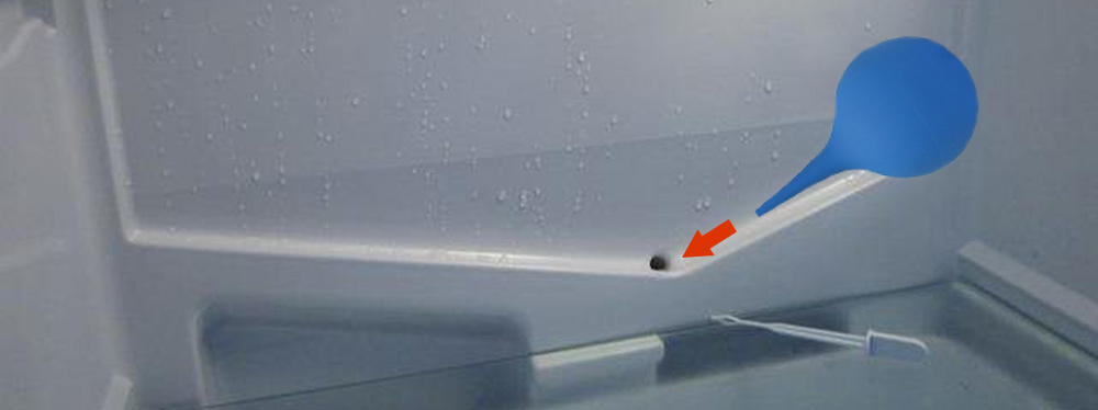 - Наберите в нее теплую воду, затем выдавите ее под сильным напором внутрь сливного отверстия, которое располагается внутри холодильного отсека.