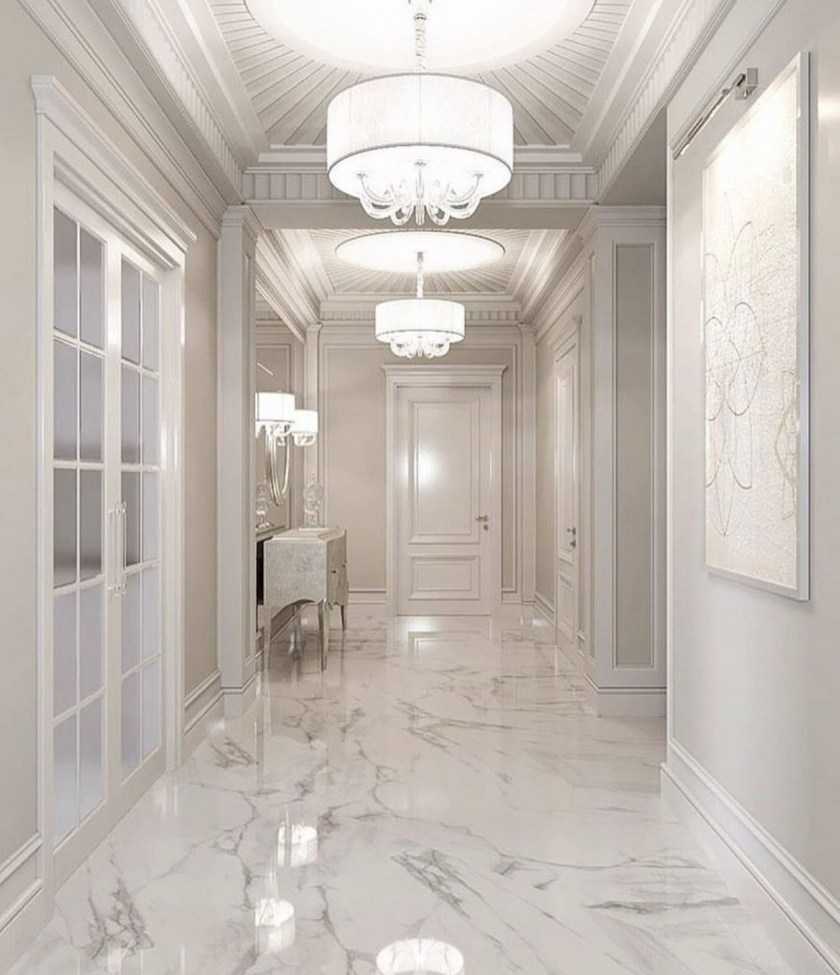 Сочетание керамической плитки и венецианской штукатурки идеально смотрится в просторном холле с высоким потолком. Правильно подобранное освещение и некоторые элементы декора смогут преобразить прихожую в просторную залу.