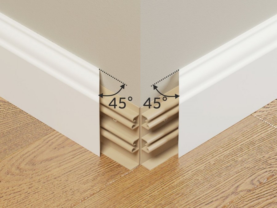 Дополнительная обработка плинтуса во время процесса монтажа не потребуется, ведь для соединения планок друг с другом применяют специальные конструкции, подобные разборному плинтусу. Несмотря на все достоинства, такой тип конструкции постепенно уступает свои позиции на строительном рынке, ведь ему на смену пришло более современное и функциональное изделие с кабель каналом.
