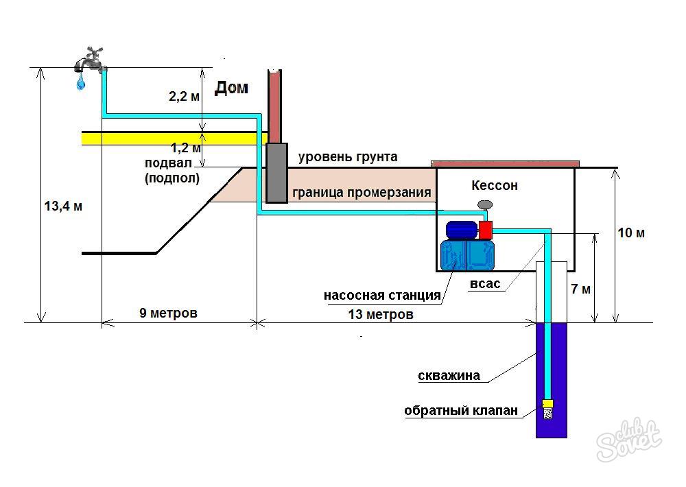 Здесь имеют значение глубина и диаметр водозабора, динамический уровень скважины, протяжённость трассы трубопровода: как горизонтальных, так и вертикальных участков. На картинке сверху представлена схема автономной системы водоснабжения, с указанием расстояний, которые должны быть учтены при подсчёте протяжённости напорного трубопровода.