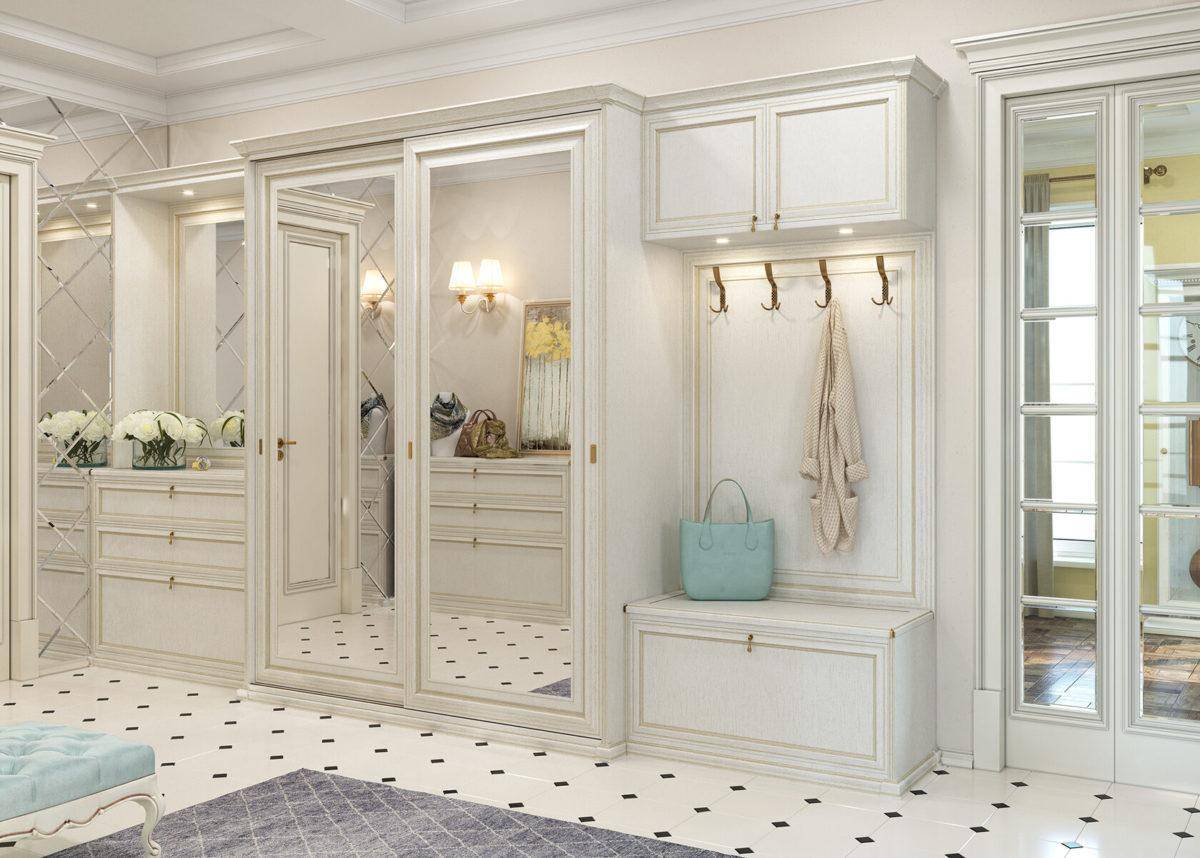 В прихожей, оформленной в неоклассическом варианте, уместно выглядят мебельные изделия с зеркальными фасадами.