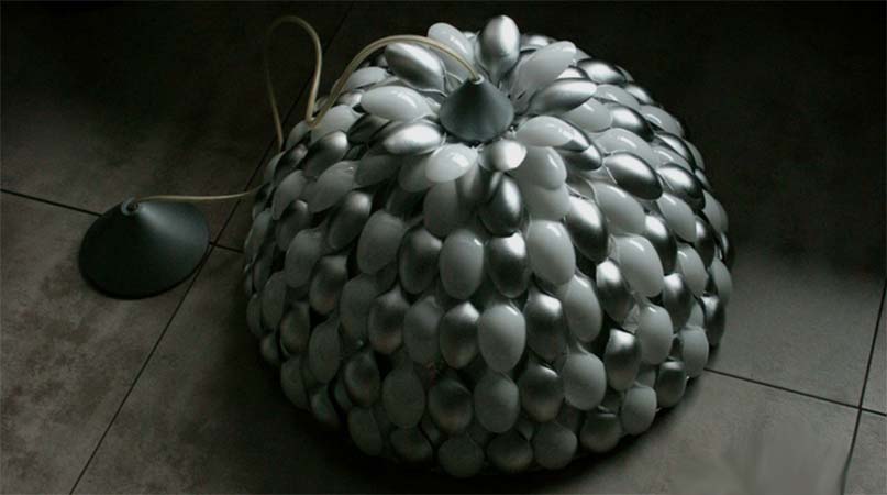 На оставленный «хвостик» нанести большое количество клея и прижать его к поверхности (выпуклой стороной ложки наружу). Необходимо покрыть всю бутылку по кругу, пока весь периметр не будет занят пластмассовыми «ложечками». Желательно расположить их в шахматном порядке и слегка сдвинуть вместе. Так останется меньше «свободных пятен». Со старой ненужной люстры нужно снять патрон, а затем поместить его в уже обклеенную и высушенную бутылку и зафиксировать на каркас. Декоративную чашу можно сделать так же из пластмассовых ложек: «черпачки» наклеить вокруг горловины баклажки. Установить и подключить люстру, проверить ее работу.