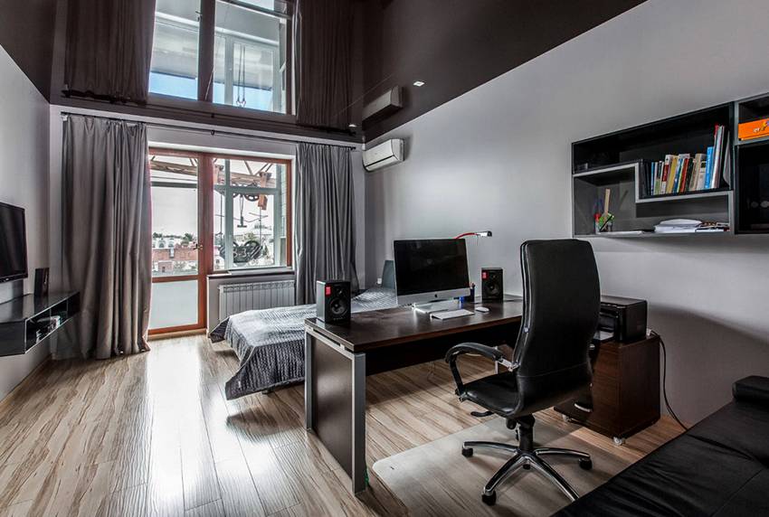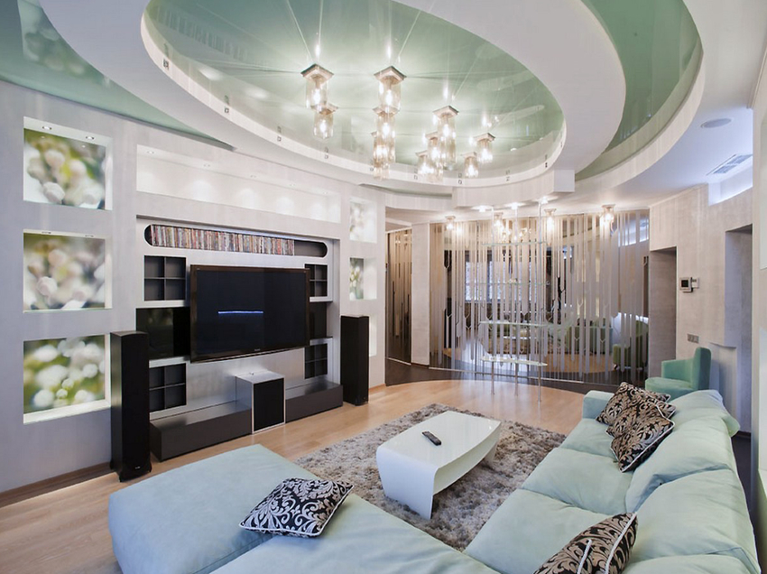Комбинированные. Составные ПВХ или тканевые покрытия применяются в многофункциональных помещениях. Например, такие потолки оптимальны для квартир студийного типа с зонированием технических и жилых пространств без устройства перегородок.