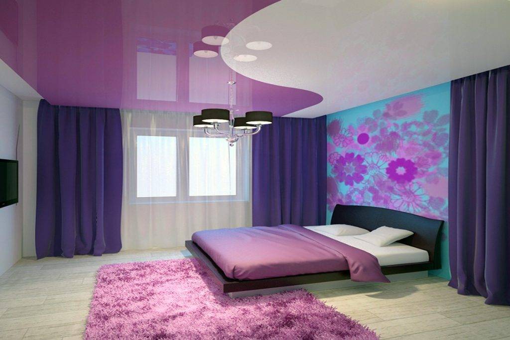 Для создания романтического настроения лучшим вариантом станет фиолетовый потолок. Такая нежная, летящая поверхность способна придать комнате таинственности и загадочности.