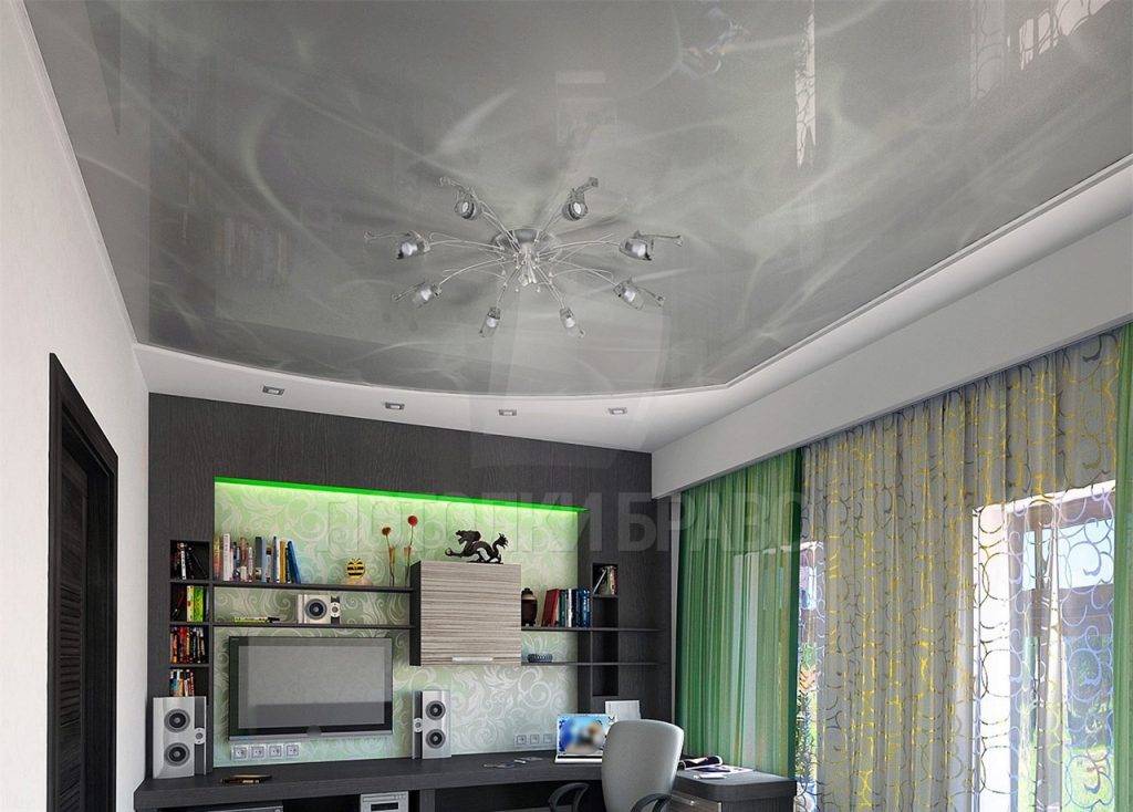 Стильно, элегантно и модно выглядит серый потолок в глянцевом оформлении. Такая сдержанная нейтральность отделки подчеркивает хороший вкус хозяев. Смело и выразительно смотрится черный глянцевый потолок. Он придает помещению глубины и магичности. Для лучшего эффекта он должен быть правильно обыгран подсветкой. Хорошим решением является выбор хрустальной люстры для натяжного потолка (фото это наглядно демонстрируют).