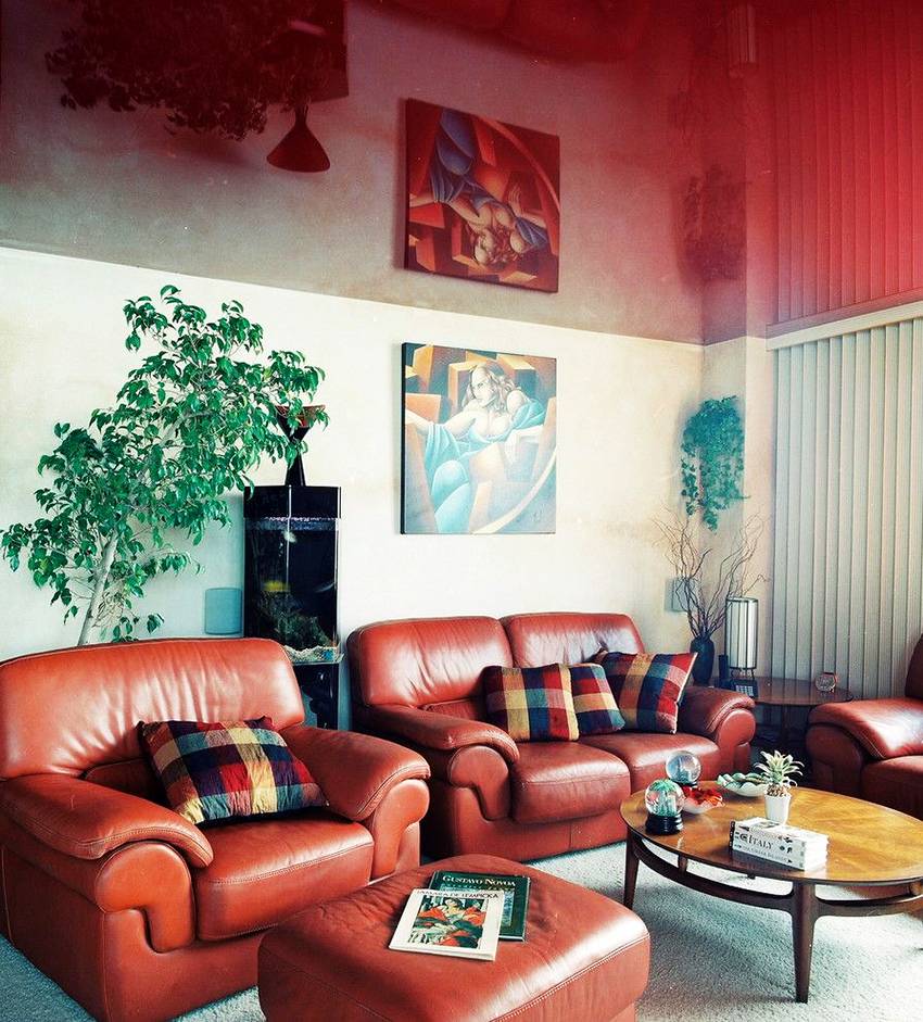 Теплые оттенки сужают помещение, поэтому такие потолки нежелательно устанавливать в небольших комнатах