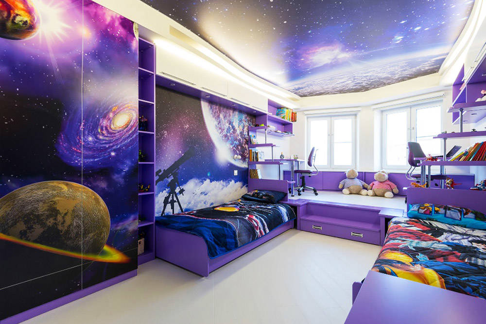 Если ровно окрашенный потолок кажется недостаточно интересным, можно нанести на него изображение. Для этого применяется фотопечать. Её наносят на любой тип материала, но эффект получается разным.