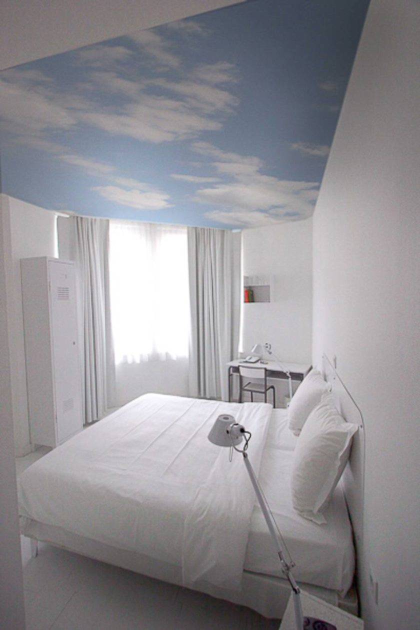 Тона лучше использовать нежные пастельные в тон основной отделки. В некоторых случаях органично смотрится и глянцевое полотно. Из принтов лучше выбирать ненавязчивые варианты – нежный цветок или небо с облаками. Старайтесь избегать ярких тонов в оформлении спальни, ведь здесь особенно ценен покой.