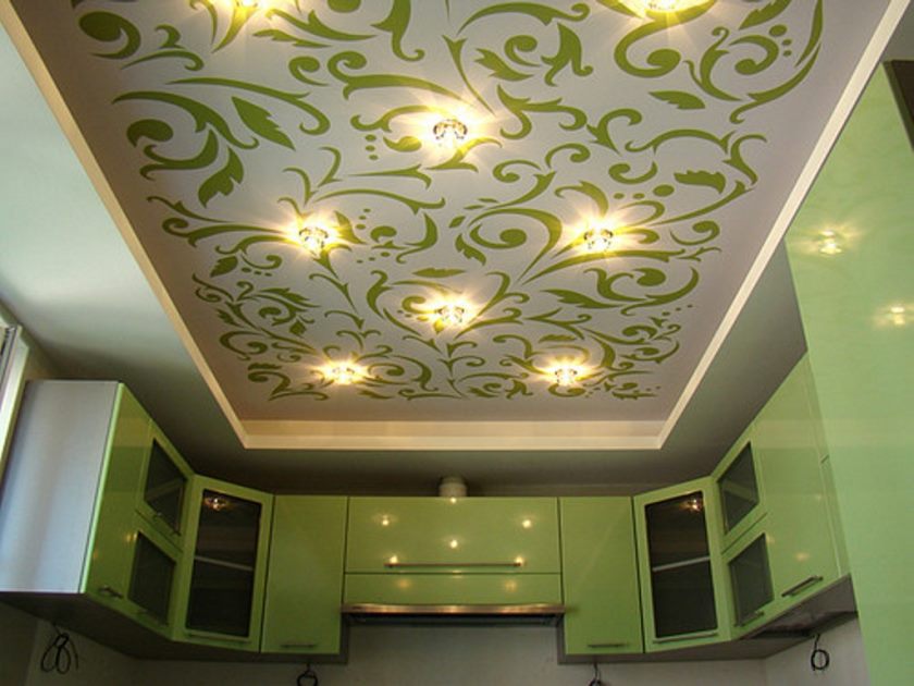 Для кухни следует выбирать потолки с высокой степенью прочности. Идеальным вариантом является матовое покрытие потолка в бежевом цвете. Использование белого цвета на кухне неуместно, ввиду его маркости.