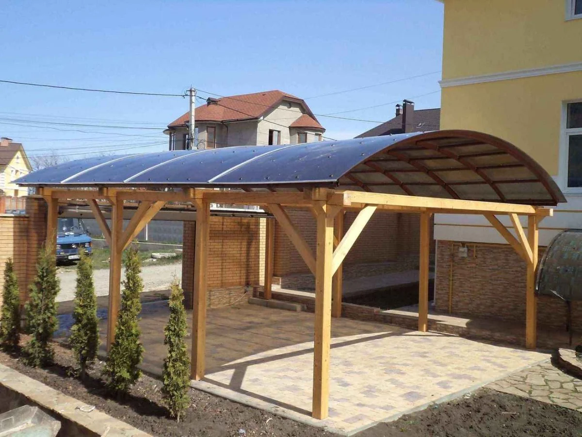 Полностью деревянные навесы для машин встречаются редко. Деревянной считается конструкция, у которой из дерева опоры, элементы каркаса и обрешётка. Кровля имеет разные покрытия.