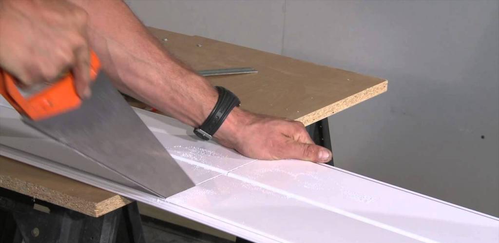 - Элементы пластиковой вагонки или панелей подрезают при помощи ножовки с мелким зубом (по металлу) или электрического лобзика до нужной длины. Рез должен быть перпендикулярным относительно оси элемента.