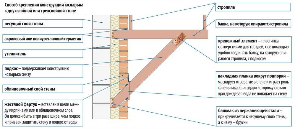 Схематично пристроенный навес, представляет собой консольно-опорную конструкцию, один край которой опирается на стену здания, а второй – на вертикальные стойки-опоры. В отличие от крыльцового козырька, размеры и вес защитной крыши получаются слишком большими, чтобы пытаться закрепить ее только консольным защемлением, поэтому приходится мириться с неизбежным наличием двух вертикальных стоек.