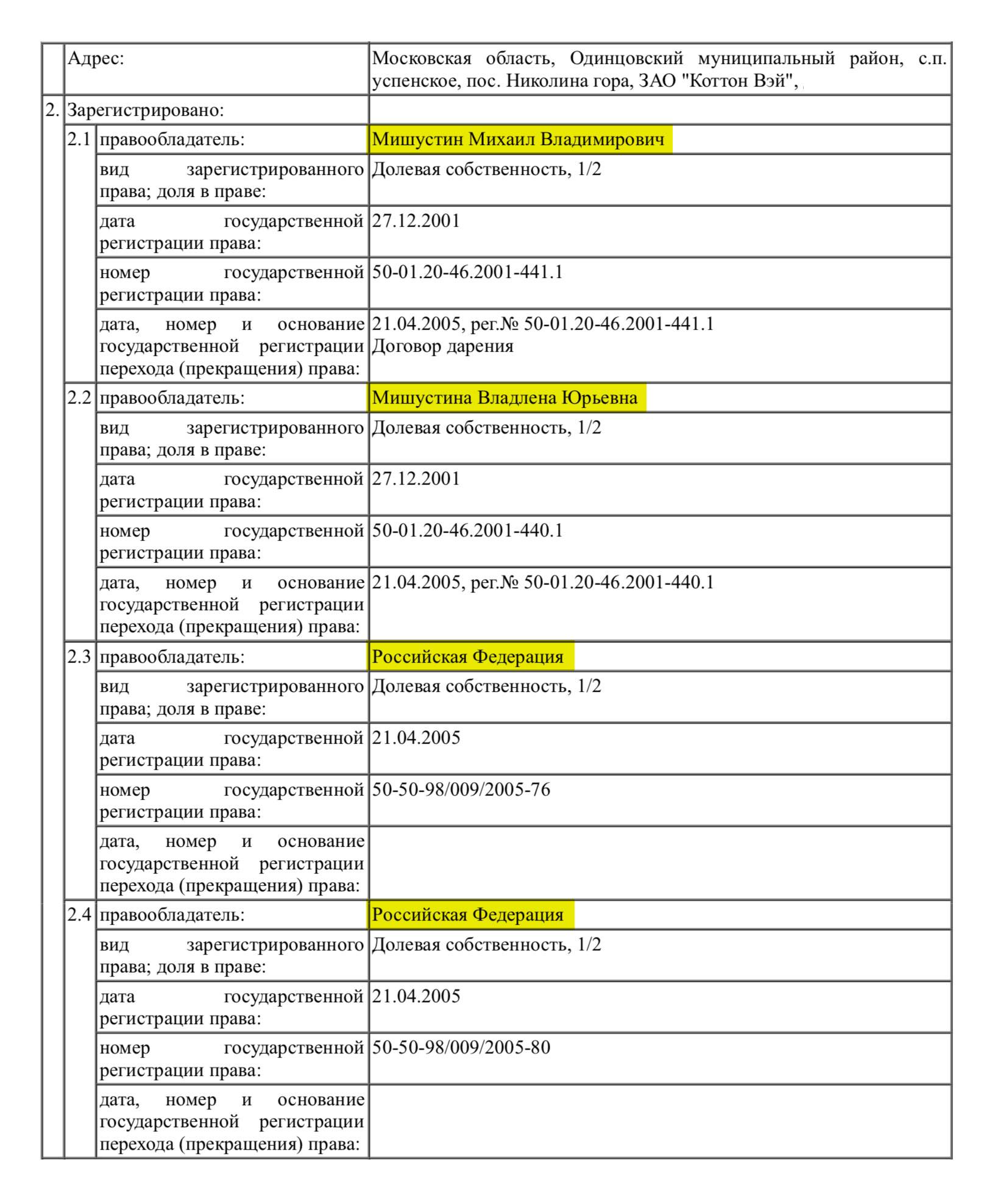 В выписке из Росреестра, которая приводится в доказательство о наличии у Мишустина большого количества участков, указывается, что приобретение двух объектов было зарегистрировано в 2005 году, а в графе «Правообладатель» указано «Российская Федерация».