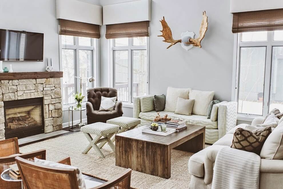Если вы хотите сделать гостиную в рустикальном стиле, обязательно добавьте в нее журнальный столик из грубой древесины. В идеале такой столик должен быть выполнен из цельного ствола дерева. Пол гостиной стоит покрыть простой керамической плиткой в песочных тонах. Дополнит дизайн интерьера мягкая мебель в грубых льняных чехлах и шкура животного на полу.