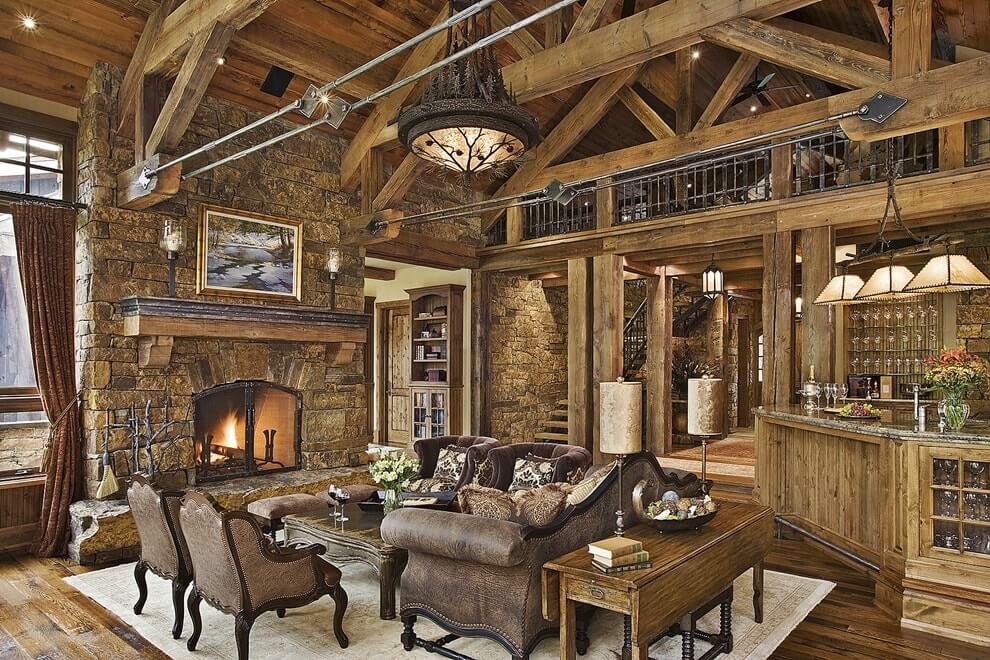 Комнаты оформлены в загородном стиле, с деревянными балками и колоннами, а также с деревянным или каменным полом. Если нет возможности применения натуральных материалов в отделке поверхностей, ситуацию могут исправить материалы с имитацией нужной текстуры.