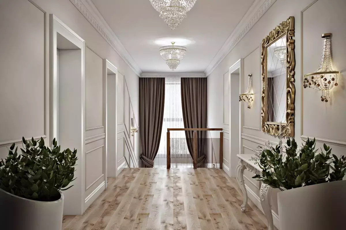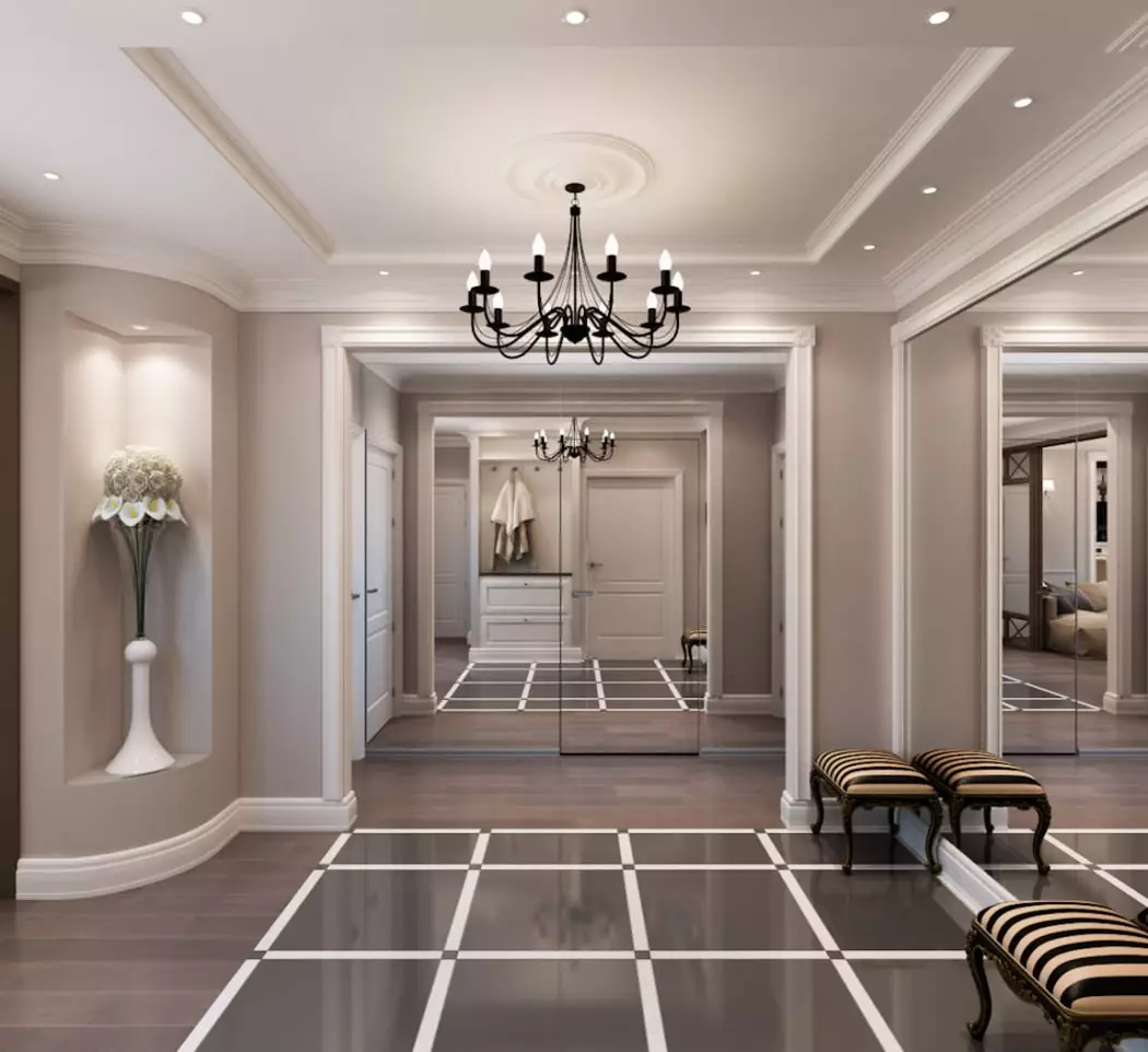 Декоративным украшением коридора станут ниши с подсветкой в виде точечных светильников. Из меблировки в помещении предполагается наличие комода, банкетки, мягких пуфов и открытых вешалок. Претенциозности добавят обстановке большие зеркала или вазы с цветами.
