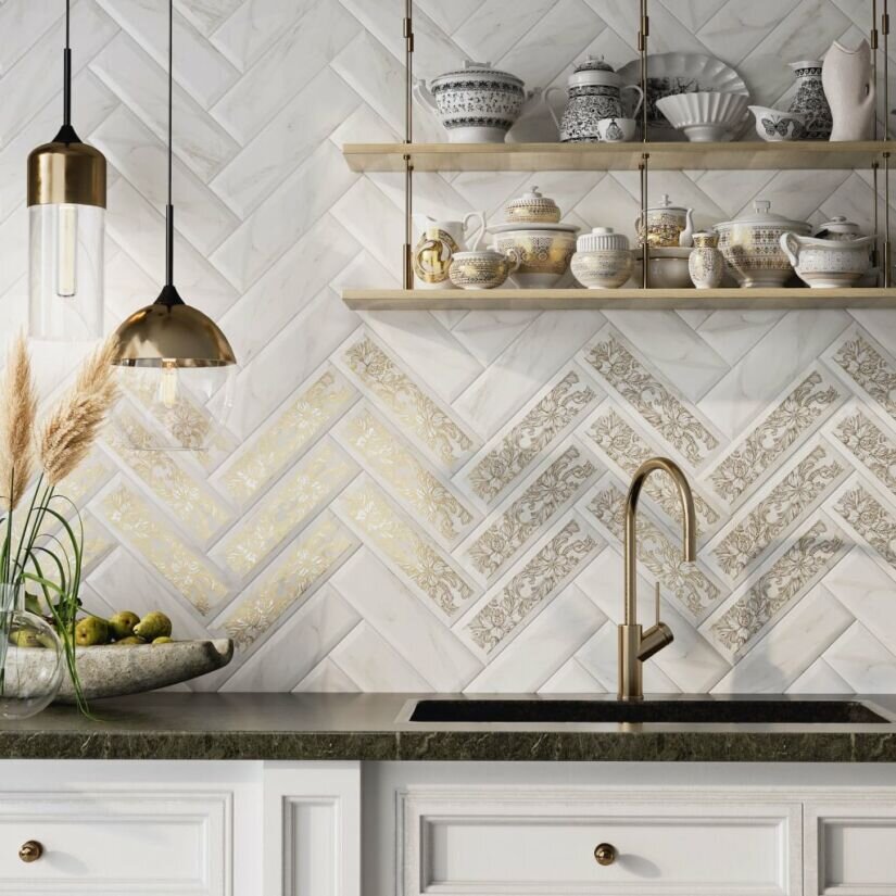 На кухне присутствуют декоративные детали в виде красивой посуды из фарфора с росписью, различных вазочек или статуэток, наполняющих обстановку изысканностью и уютностью.