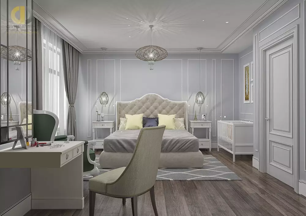 Дизайн спальни в стиле неоклассика отличается максимальной симметричностью. В качестве центральных предметов используют кровать, потолочную люстру и ковер, относительно которых выстраиваются другие интерьерные элементы.