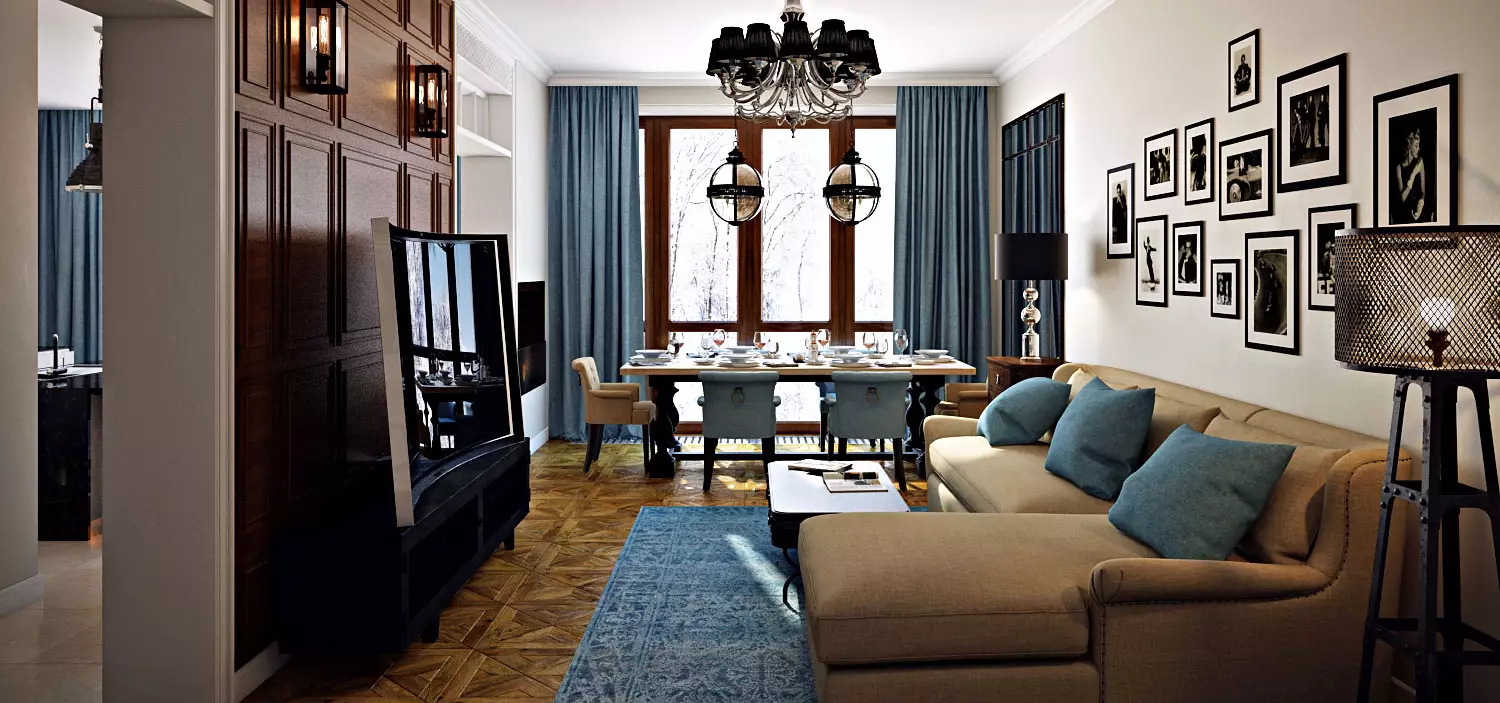 Для визуального увеличения пространства, неоклассика в интерьеретребует использования пастельных, светлых тонов (голубой
