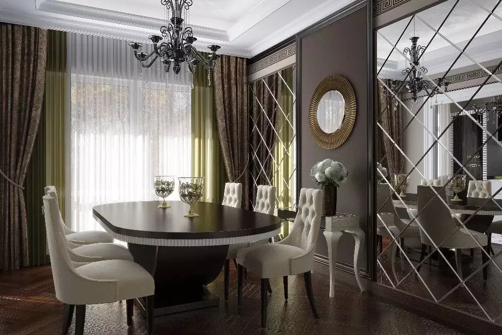 В неоклассических интерьерах распространены зеркальные поверхности: глянец, стекло, зеркала. Такие вставки зрительно увеличивают и расширяют помещение, делают его светлее и торжественнее.