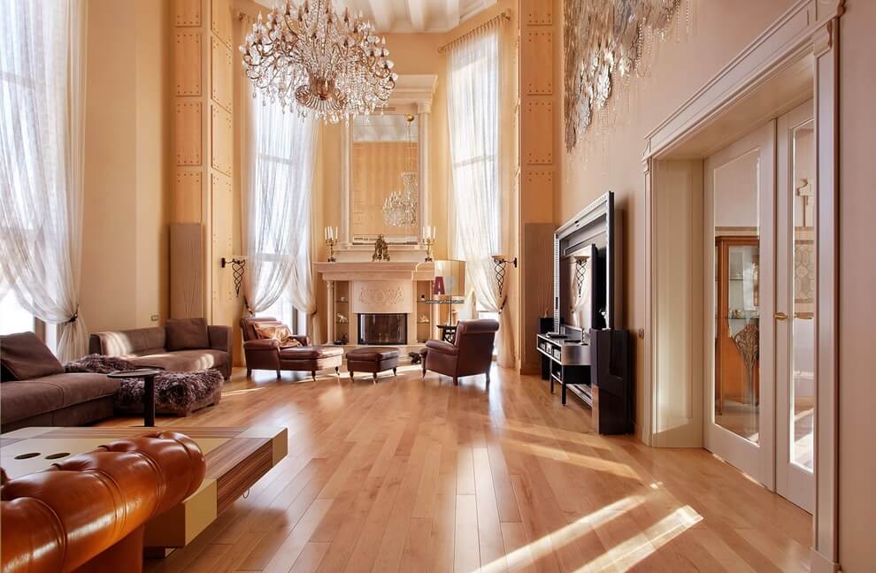 Вне конкуренции всегда остается натуральное деревянное покрытие. Оно впишется в интерьер, будет теплым. Если же возможности использовать натуральное дерево – нет, то предпочтение отдается ламинату натурального цвета. В гостиной также используется крупная плитка, которая по виду напоминает мрамор.