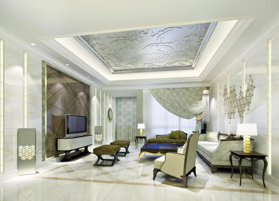 Украсить стены в гостиной позволит декор в виде зеркал, барельефов, статуэток или ваз. Покрытие пола выполняется, как в однотонном варианте, так и дополняется орнаментами или рисунками в центре. Подчеркнуть оконные рамы можно переплетами или витражами.