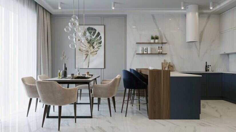 В столовой в неокласической стилистике присутствуют натуральные материалы в достаточном количестве. Для облицовки пола идеально применение мрамора или керамогранита. Рабочую зону оформляют керамикой или моющимися обоями. Для практичности выбирают стулья с обивкой из кожи. В маленькой кухне в хрущевке более уместно смотрится светлый гарнитур с остекленными фасадами.