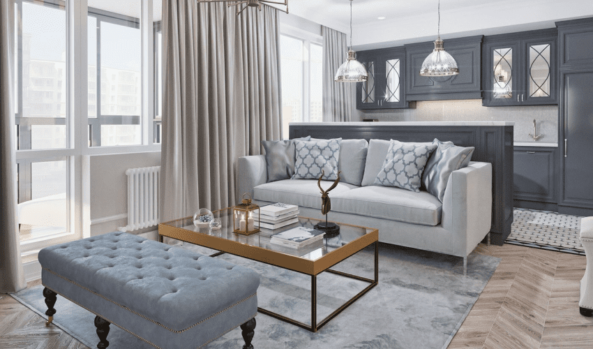 Для визуального увеличения пространства, неоклассика в интерьеретребует использования пастельных, светлых тонов (голубой