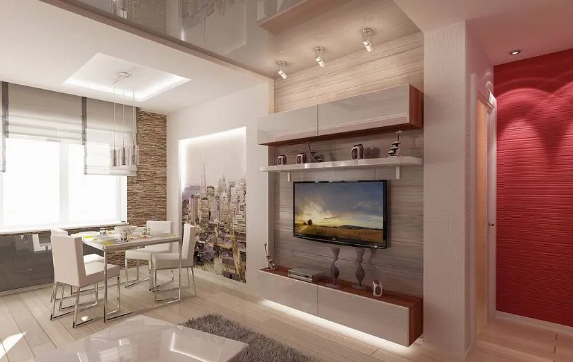 В центральной части помещения можно разместить телевизор или стол, а параллельно стенам – расположить мягкий уголок. Это позволит разделить прихожую с гостиной на зоны. В подобной ситуации вся площадь комнаты будет использована максимально рационально. Мебель необходимо тщательно подбирать и размещать только самые необходимые предметы, которые точно нужны в этом помещении. В противном случае пространство может казаться слишком загроможденным, а передвижение по комнате станет затруднительным.