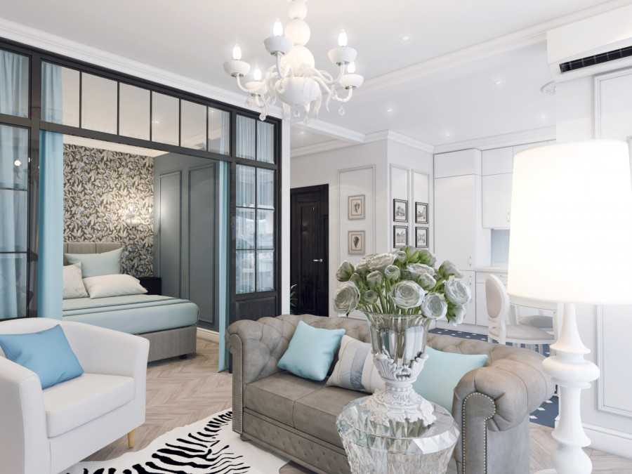 Зонирование осуществляется с помощью легких мобильных перегородок светлой расцветки, чтобы не перегружать пространство: ведь такие элементы занимают мало места. Иногда используются полки, стеллажи, перегородки из стекла или ткани.