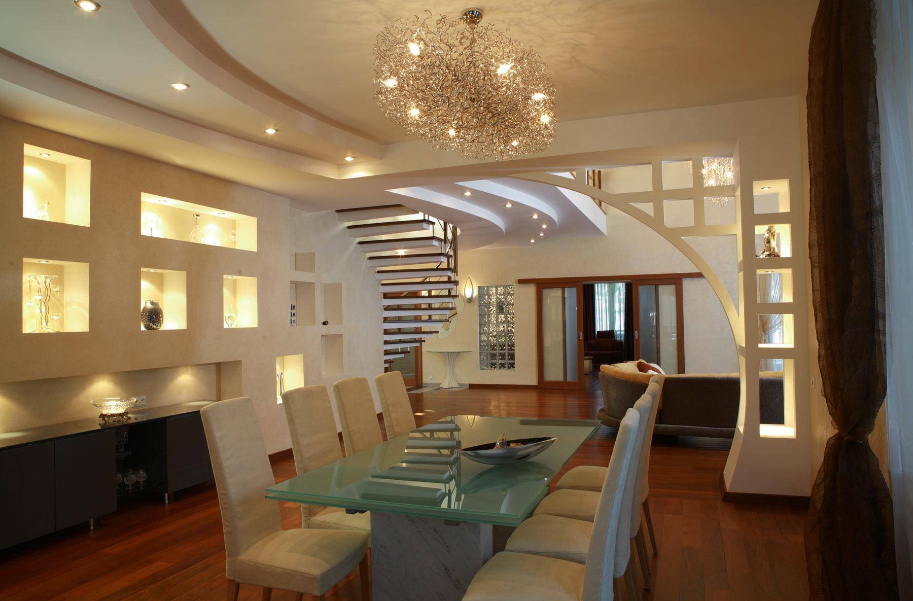 В глубокие ниши можно непосредственно монтировать разнообразные светильники, выступающие самодостаточными декоративными элементами и дополнительной подсветкой.
