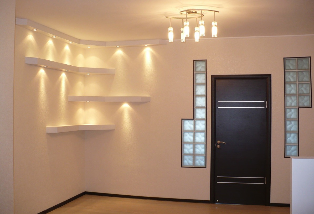 Оригинальным и функциональным решением для любого интерьера станет ниша из гипсокартона с подсветкой. В маленьких помещениях именно ее можно использовать как систему хранения и отказаться от установки громоздких стеллажей. Нишу с подсветкой можно сделать для красоты. Она не займет много места, но украсит интерьер и сделает его уютным.