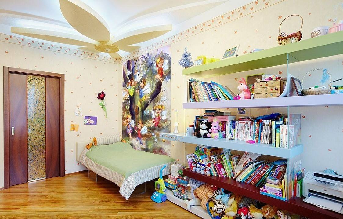 Для детской комнаты подойдут невысокие полочки. Так ребенок сможет легко дотянуться до любой полки. Там можно разместить учебники, школьные принадлежности. Полки в детских декорируют лентой из светодиодов и мягкими игрушками. Для ленты желательно сделать короб, он намного упростит монтаж и не даст ей перегреваться.