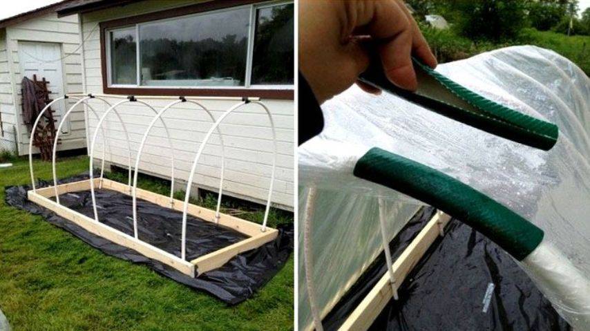 При создании небольшого парника с дугами отрезки разрезанного вдоль шланга отлично можно использовать.