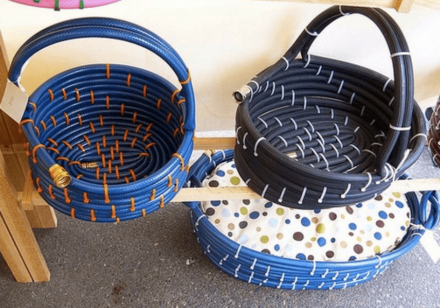 - необычные корзины и лежанки для домашних питомцев также получатся из старого садового шланга. Их следует сложить по кругу или в виде овала. Между собой слои скрепляются, а ручка выполняется прочным фиксированием при помощи металлической трубы. Такие корзинки будут особо легкими.