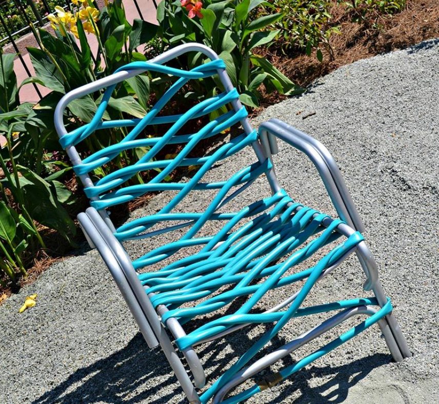 Как оказалось, шланг к садовой мебели имеет самое прямое отношение. С его помощью можно отреставрировать, к примеру, старый стул, превратив его в некое подобие шезлонга. И ведь действительно, сидеть на такой конструкции будет очень приятно. Переплетённая резина пружинит и позволяет телу принять то положение, которое ему требуется.