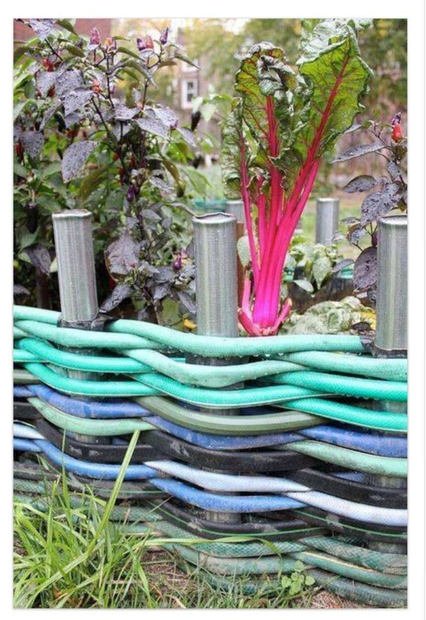 Также садовые шланги используют для изготовления скамеек, а также декорирования старых шкафов или комодов внутри дачных домиков. Но самое широкое распространение старые шланги получили в области наружного декора садовых домиков и участков.