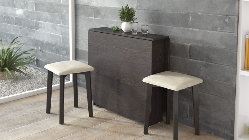 Стол-книжка спасет комнату от большого количества мебели. В закрытом виде он занимает очень мало места. Если вы хотите посидеть вдвоем, то можно поднять только одну половину стола. А когда собираетесь всей семьей, то поднимаете обе половины. Хорошо на такой случай приобрести складывающиеся стулья, которые сэкономят много пространства.