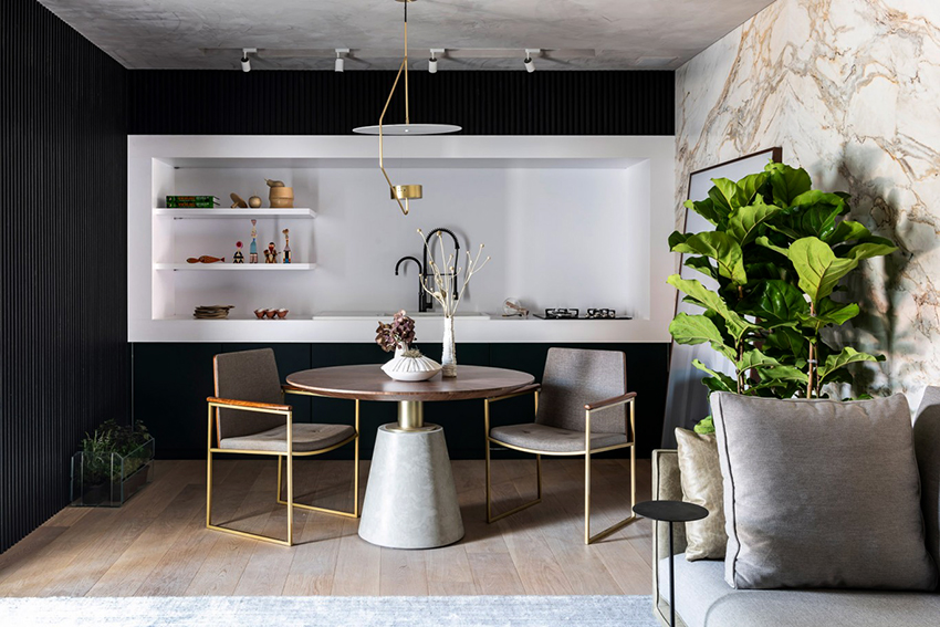 Если обеденная группа отделяет кухонную зону от гостиной в квартире-студии, над ней лучше расположить группу светильников, объединенных между собой. Этот прием создаст эффект отдельного помещения и визуально разграничит комнаты.