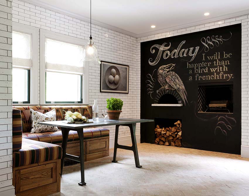 Грифельные доски с нарисованным мелом меню уже прочно вошли в интерьеры многих кафе. А ведь такая идея легко повторима на собственной кухне. Можно повесить на стену меловую доску, покрыть стену грифельной краской или оклеить ее специальными обоями.