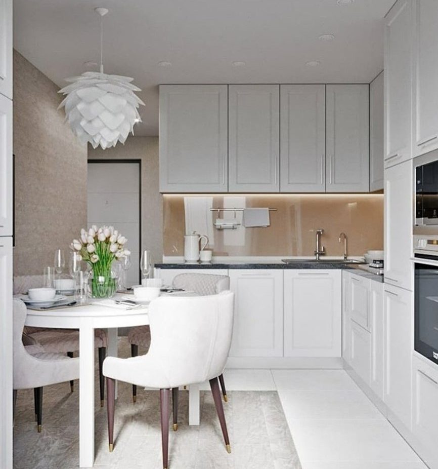 Один из наиболее популярных вариантов дизайна кухни-столовой. Классический интерьер всегда актуален, нейтральная цветовая гамма, гармония и симметрия уместны в любой ситуации.
