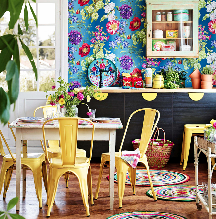 Стену рядом с обеденной группой можно сделать яркой и эффектной