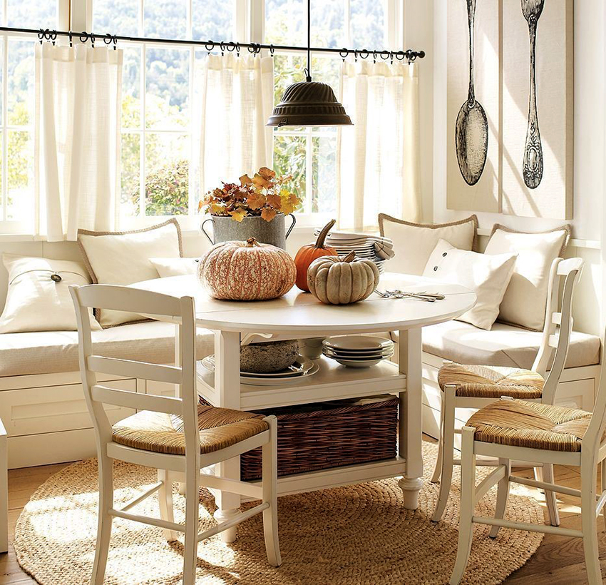 Такого же эффекта изолированности можно добиться, оборудовав обеденную зону в углу. Чтобы создать уютный «закуток», обеденный уголок можно ограничить: с одной стороны стеной, а с другой — легкой конструкцией или предметом мебели. Обеденные уголки зачастую не слишком удобны, зато поразительно уютны. Этот вариант подходит небольшим семьям.