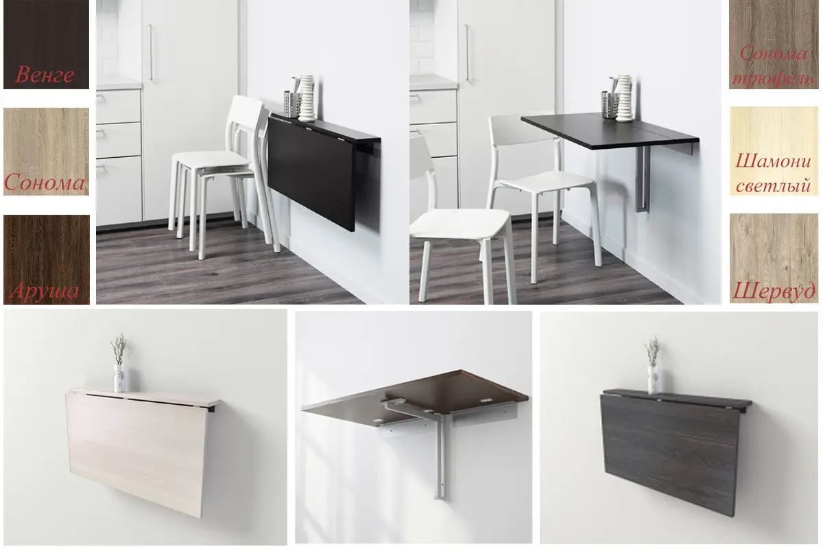 Данные изделия идеальны для небольших кухонных помещений, так как представляют собой компактную панель, которая располагается на стене. В случае необходимо, нужно опустить столешницу вниз. Такими столиками оснащены купе в поездах.