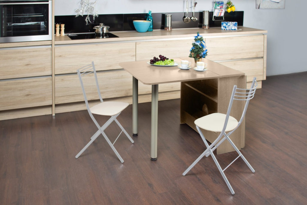 Раскладной стол актуален для маленьких по площади кухонь. От ненадобности его убирают, и пространство освобождается. По механизму раскладывания они делятся на: