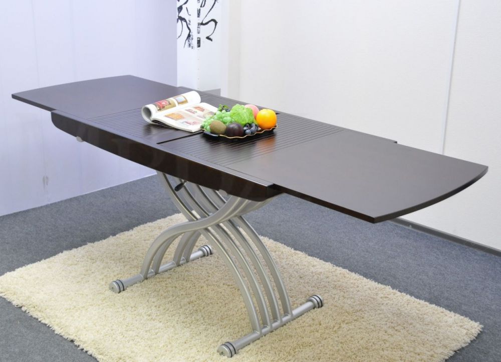 Стол-трансформер, в зависимости от ситуации, может быть журнальным или обеденным. Волшебное превращение происходит благодаря подъёмному механизму и складной столешнице. Существуют и более экзотические варианты, когда в стол трансформируются консоли окон или стеллаж.