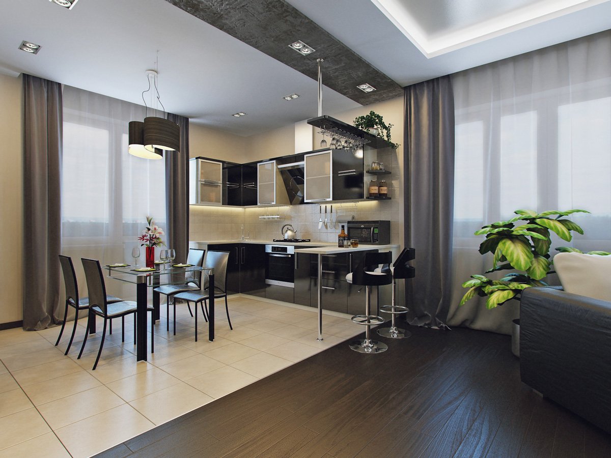 В оформлении совмещенной кухни-гостиной довольно большую роль играет цветовая гамма. Безусловно наиболее часто люди останавливают свою выбор на классических, холодных оттенках. Это черный, коричневый, серый или же белый цвет. Они идеально подходят для совмещенной кухни-гостиной, делают ее еще более просторной и светлой.
