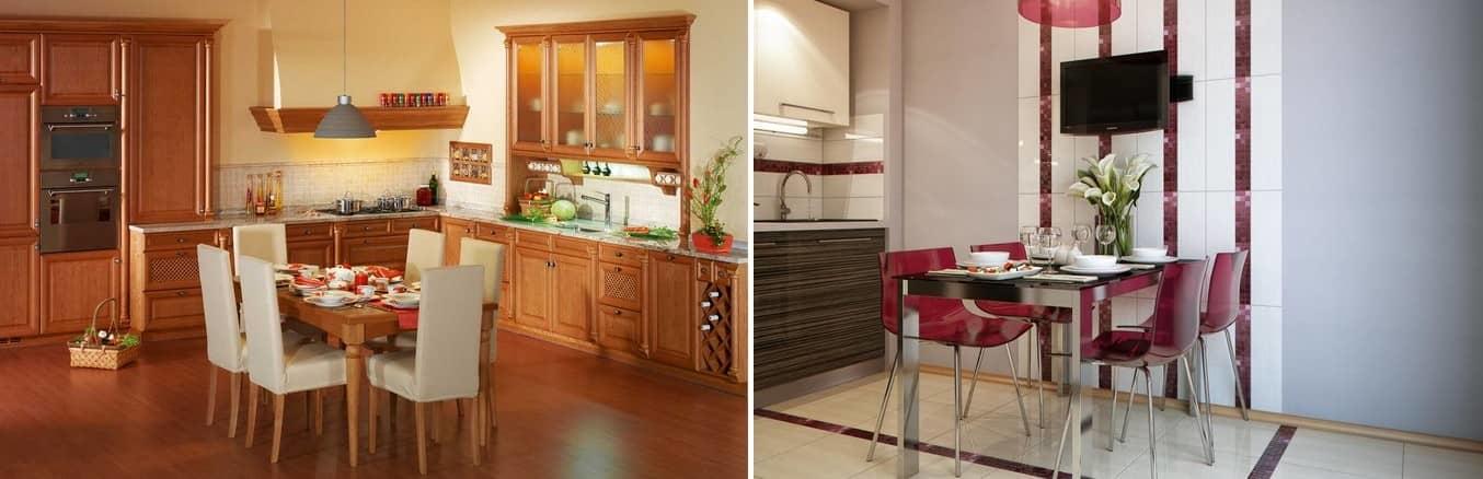 - дизайн обеденной зоны кухни зависит от формы обеденного стола и его размещения;