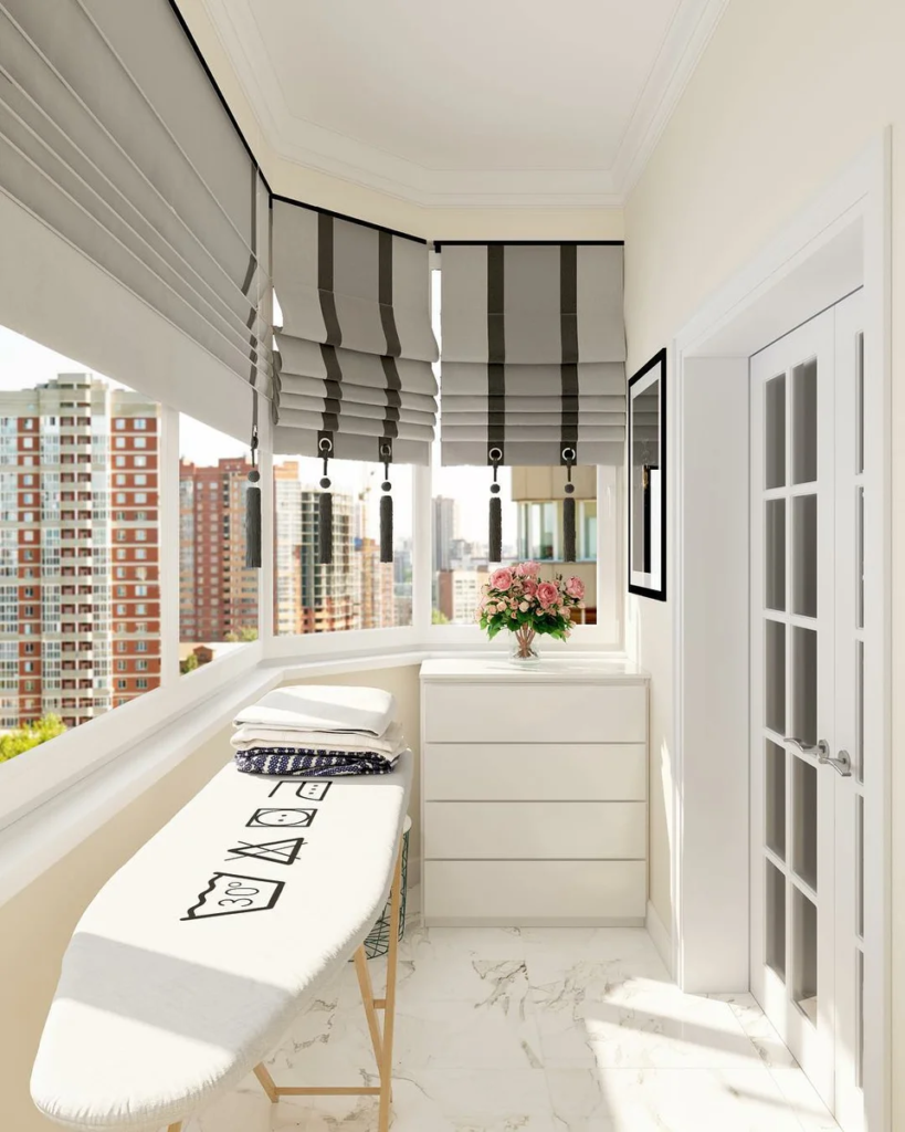В частности, размещение на присоединенном балконе рабочего кабинета позволяет решить проблему с невозможностью уединиться для работы или обучения. Балкон, объединенный с детской комнатой, будет отличным местом для детских игр, где можно расположить ящики с игрушками. Или же гардеробная комната на лоджии, присоединенной к спальне, решает проблему с размещением шкафов и комодов для различных вещей. Здесь же можно разместить и гладильную доску, которую всегда так сложно пристроить в маленьких квартирах. Из балкона, прилегающего к кухне можно сделать барную зону или кладовую для хранения припасов. Самым простым и приятным решением для балкона или лоджии будет размещение там комнаты отдыха и релаксации.