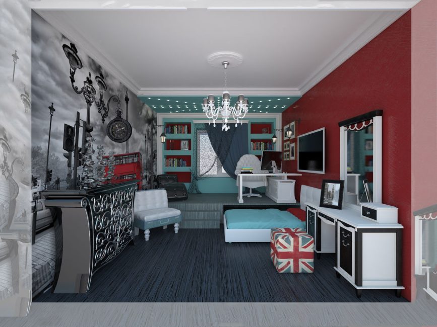 Ярко-красное кресло-мешок отлично дополнит лофтовый дизайн детской. Красочные постеры и афиши украсят комнату юного любителя комиксов, а фотообои с красным лондонским автобусом или телефонной будкой впечатлят подрастающих любителей английского.